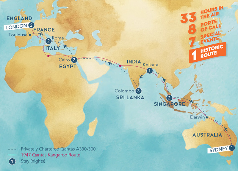 Step aboard a privately chartered Qantas Airbus A330-300 and retrace the legendary Kangaroo Route from Sydney to London in unparalleled style. This exclusive 14-day journey, curated by Captain’s Choice, revives the magic of long-haul luxury with eight extraordinary stops along the way. This all-inclusive experience offers seamless service, and immersive local encounters; more than just a flight, it’s the adventure of a lifetime!